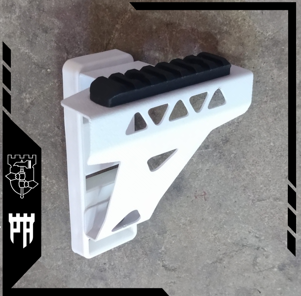 A versatile mounting solution designed to hold any Picatinny rail-compatible tactical accessories. This holder provides a secure and stable mounting point on your pegboard system, allowing for easy organization and quick access to optics, lights, grips, and other attachments. Built for durability and precision, it ensures your gear stays ready and within reach.