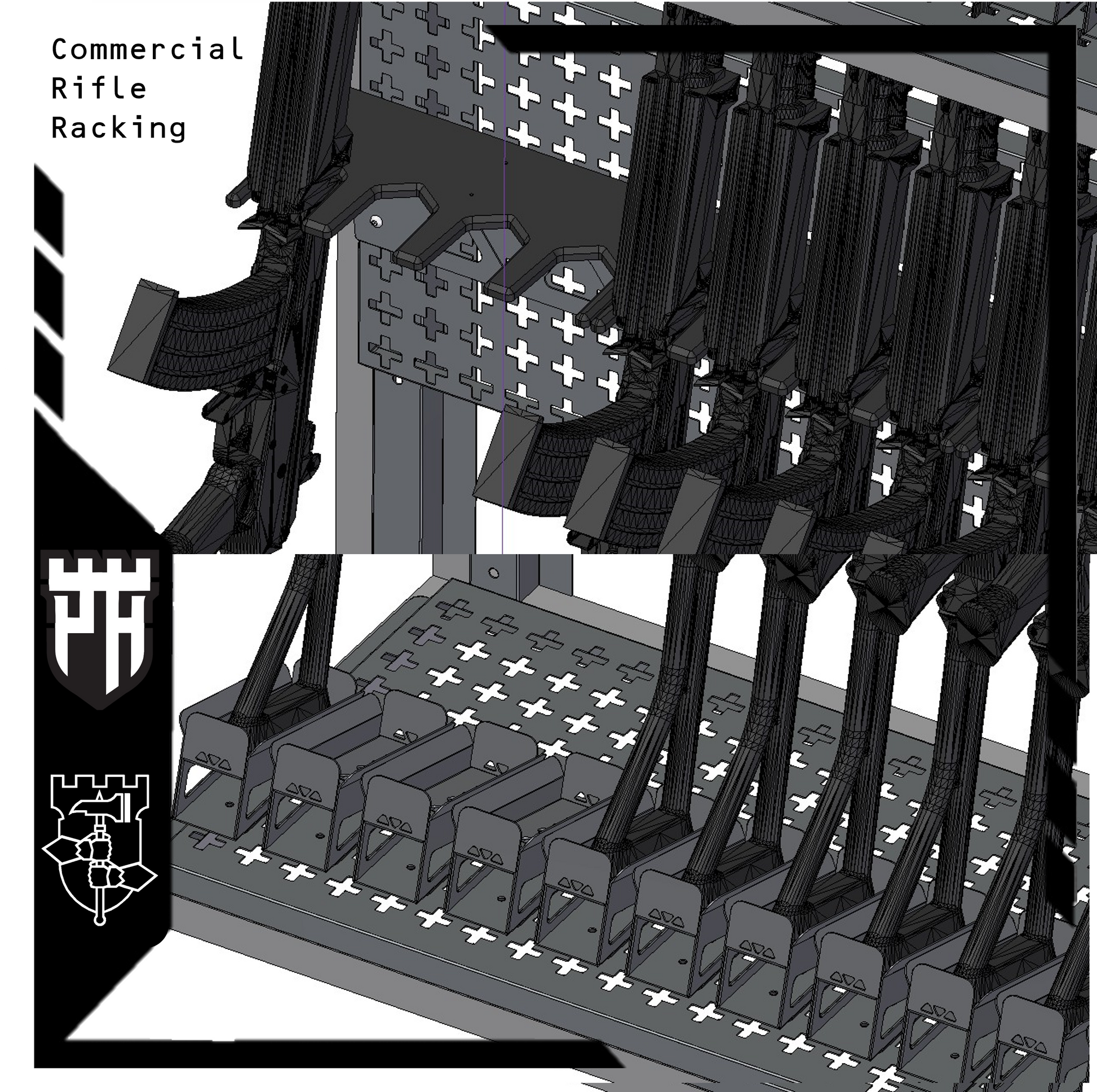 The Adjustable Buttstock Container mounts securely into our Compact Vertical Racking Shelf Base. It supports rifles individually by holding the buttstock at a distance from the pegboard, allowing for a customised and secure vertical angle. The Vertical Racking Upper then secures the rifle in position.