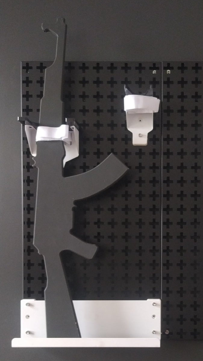 Holds 2 rifles per accessory flat against Pegboard.