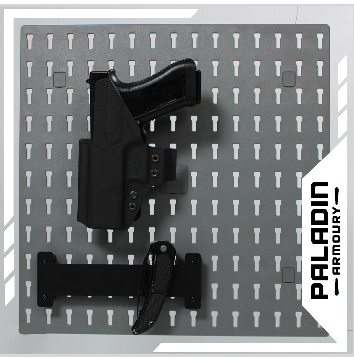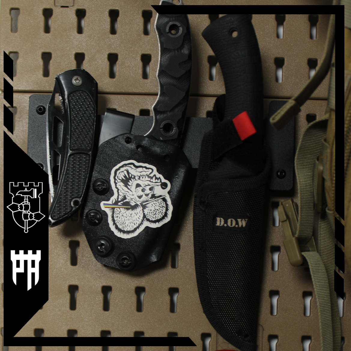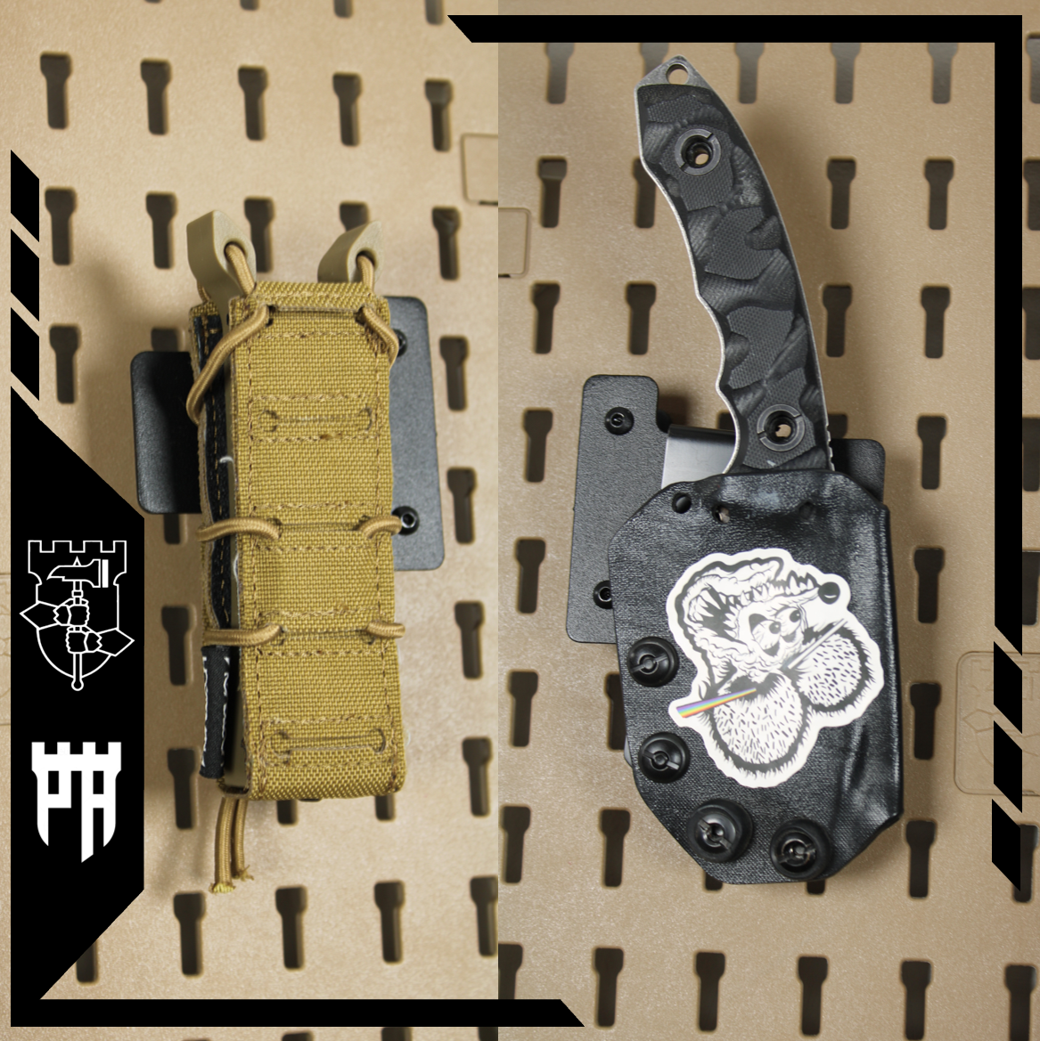 Our Pack of knife sliders comes with 2 of each variant, a two-point mount slider and a single point. these Sliders allow for the display of knives with clips, sheaths, holsters, molle pouches, and mag holders. Pretty much anything with a Clip or belt-like slot.