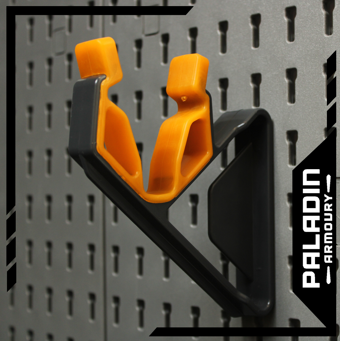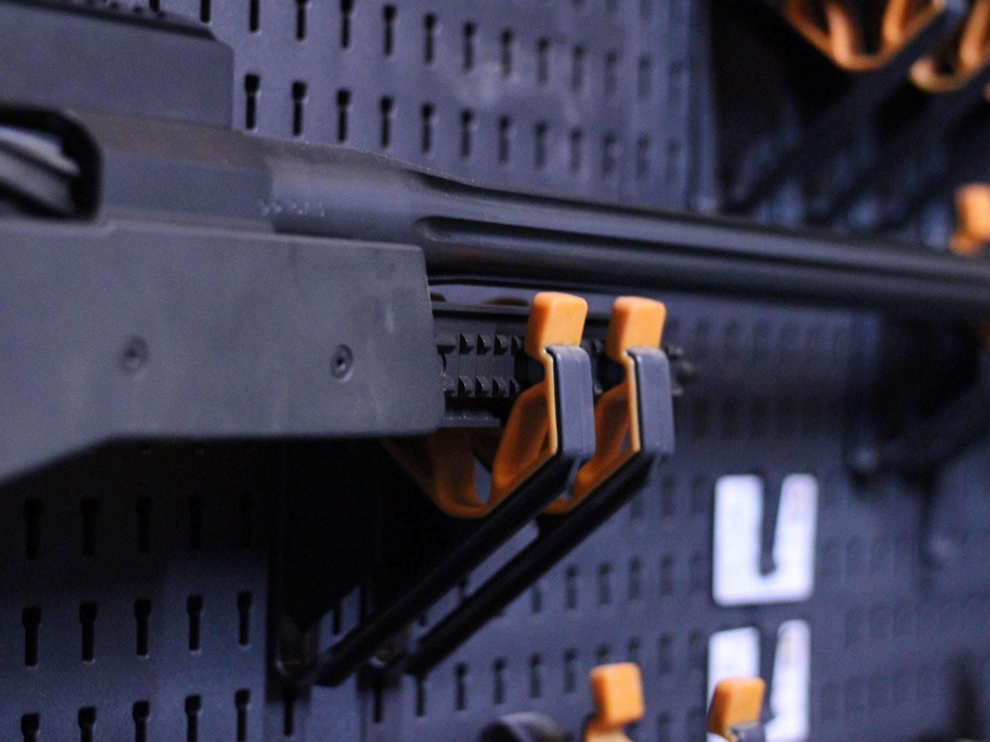 Firearms/Rifle specific display. Our rifle hook is a purpose-built attachment that securely holds rifles and long guns upright or sideways on the Paladin Armoury pegboard. It locks in with a reinforced mounting system, preventing unwanted movement while keeping your firearm accessible, organized, and off the ground. Ideal for safes, gun rooms, ranges, or retail displays.