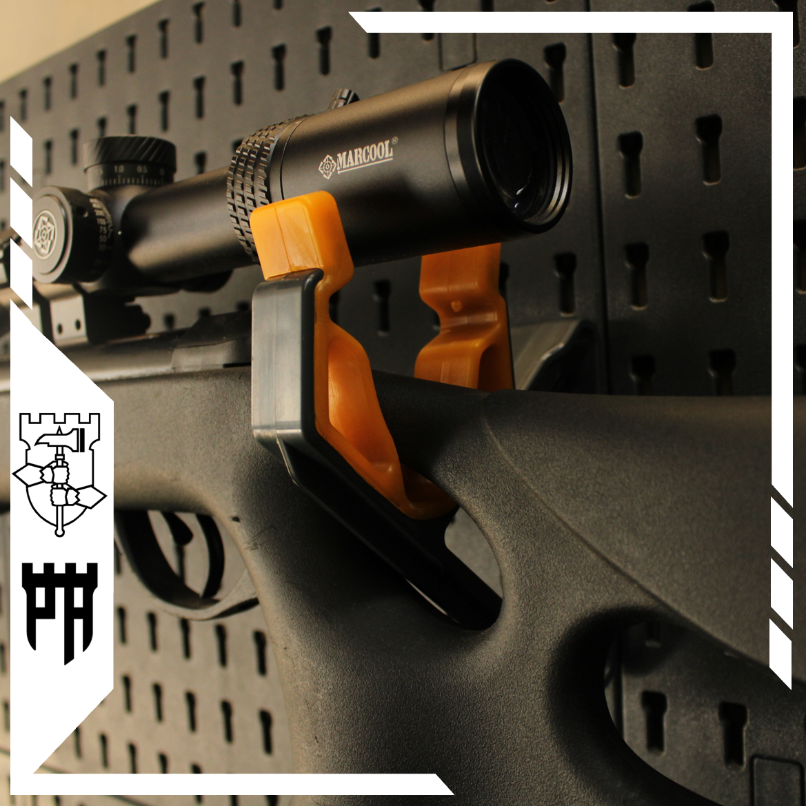 - The Rifle hook holds Rifles 65mm off the Pegboard wall.