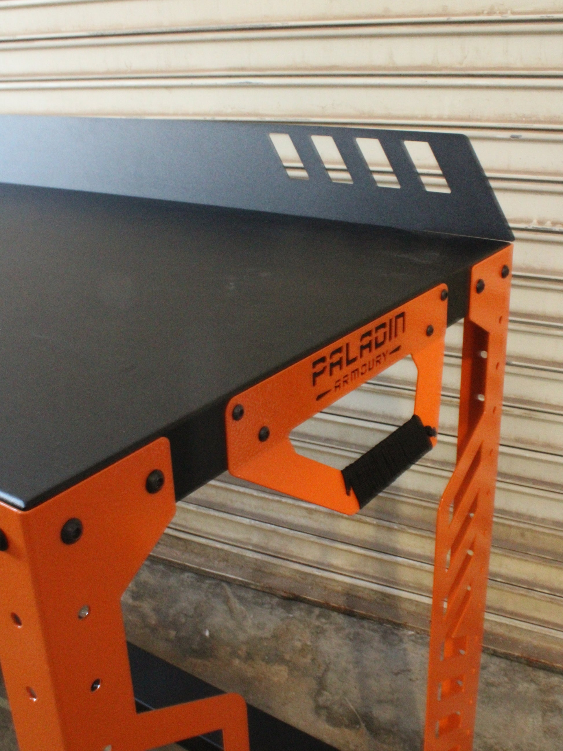 2 Tier Table Top with Additional Shelf: Take your organization to the next level with our second variant, boasting a two-tier tabletop design and an extra shelf for enhanced storage capabilities. Store essential tools, accessories, or ammunition components on the additional shelf, while keeping the workspace clutter-free. The open bottom design provides convenient storage space for boxes or containers, ensuring easy access to your supplies.